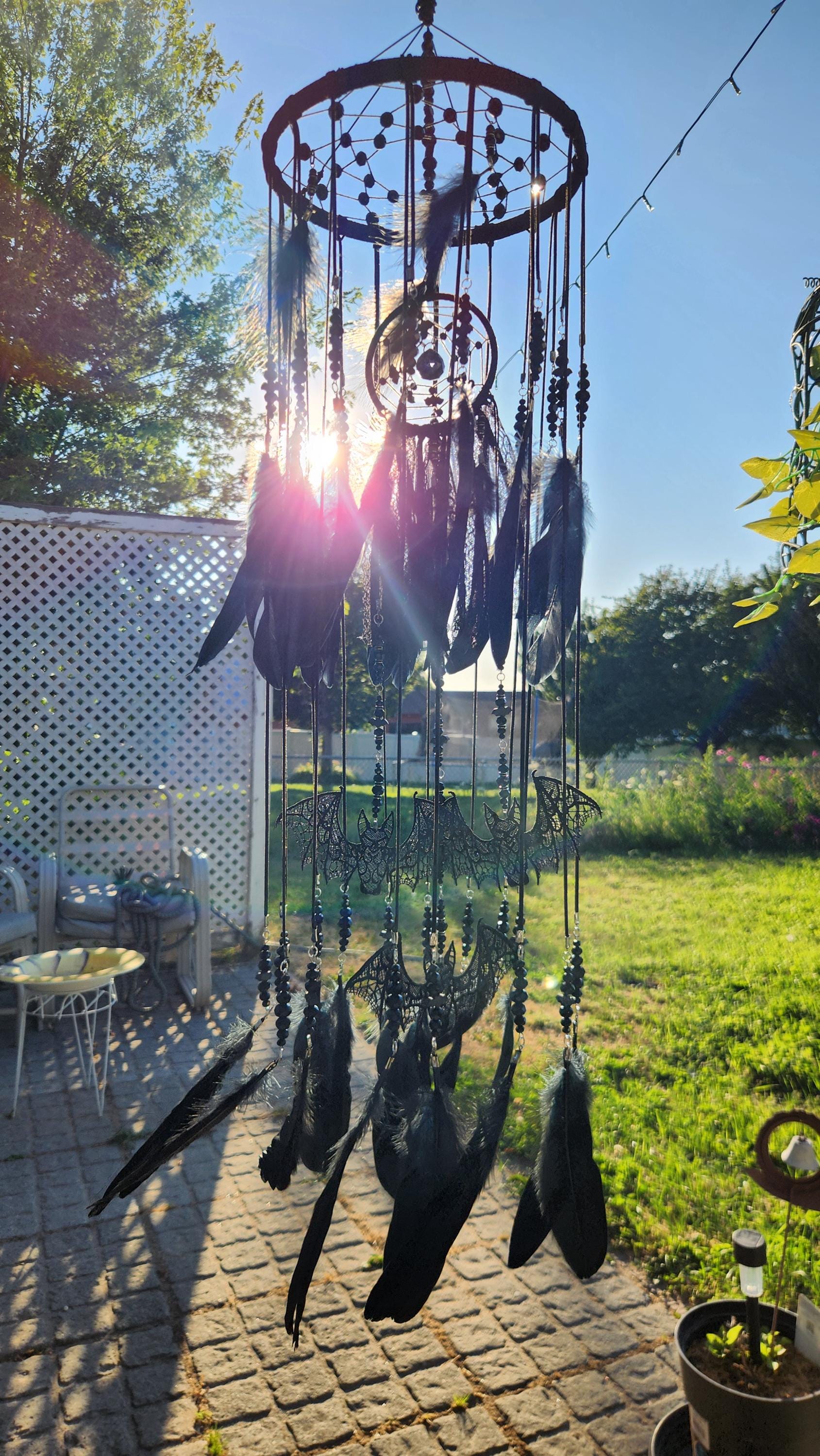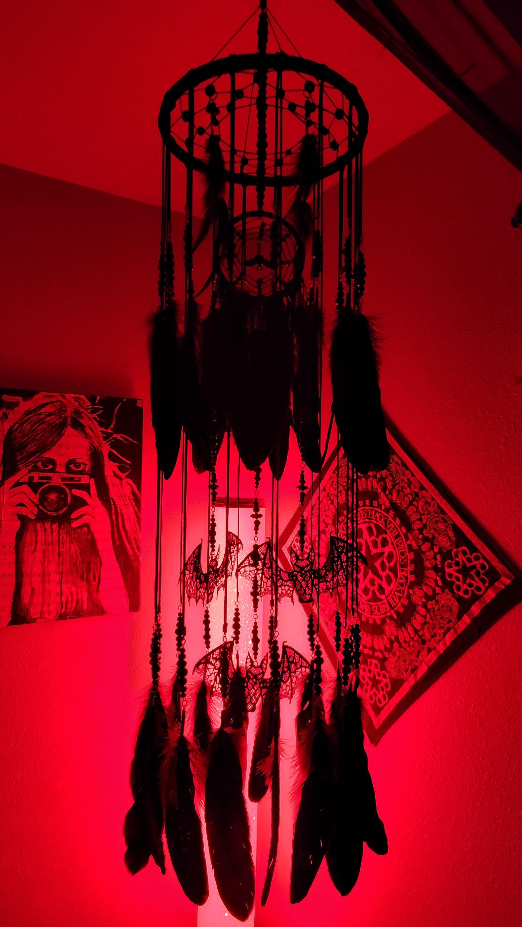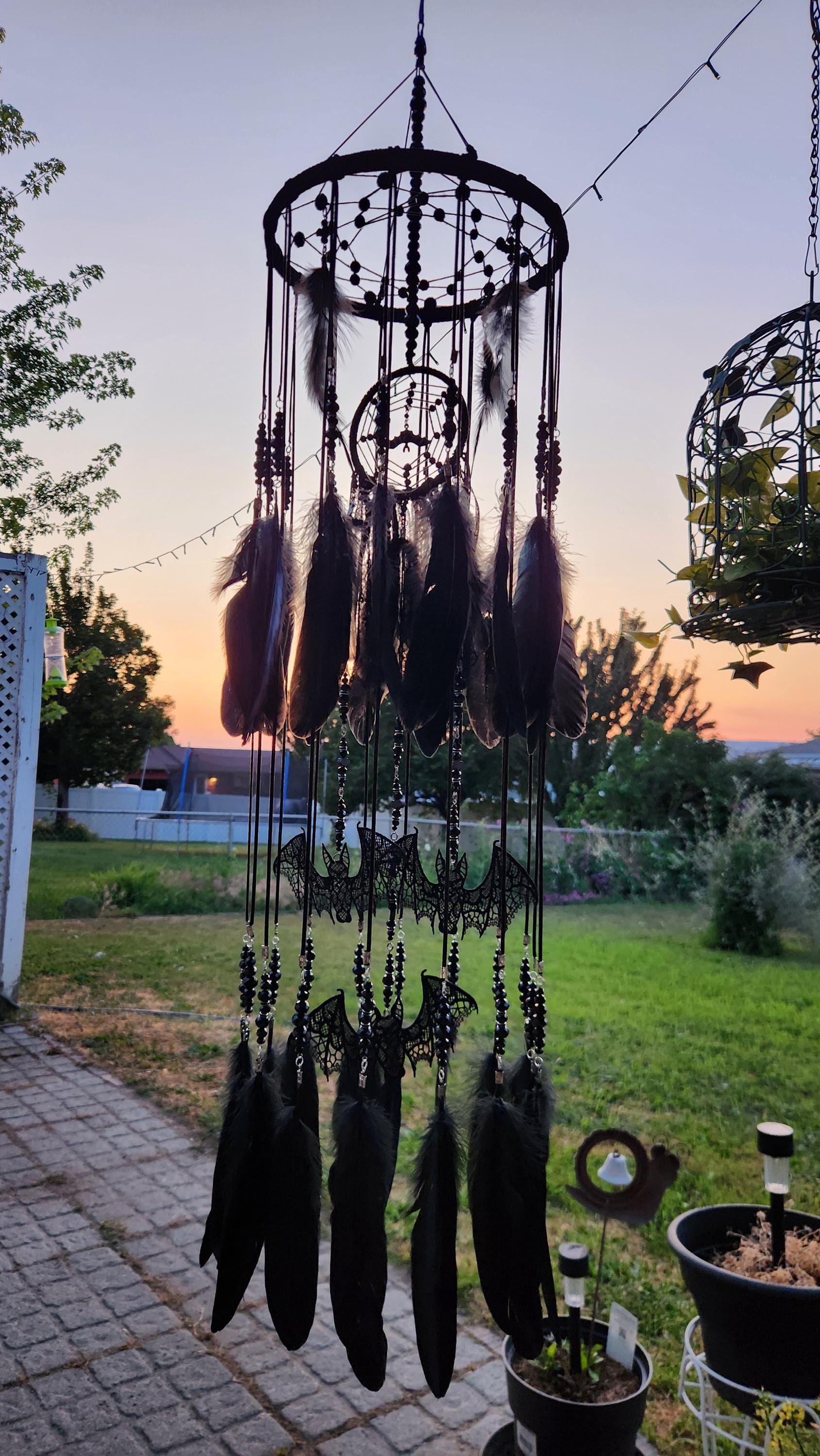 This isn’t just a DreamCatcher — it’s a full-blown gothic enchantment swirling with black crystal beads, cascading feathers, eerie lace, and bat magic. Towering in size and presence, this mobile is meticulously handcrafted over several days to summon both elegance and edge.